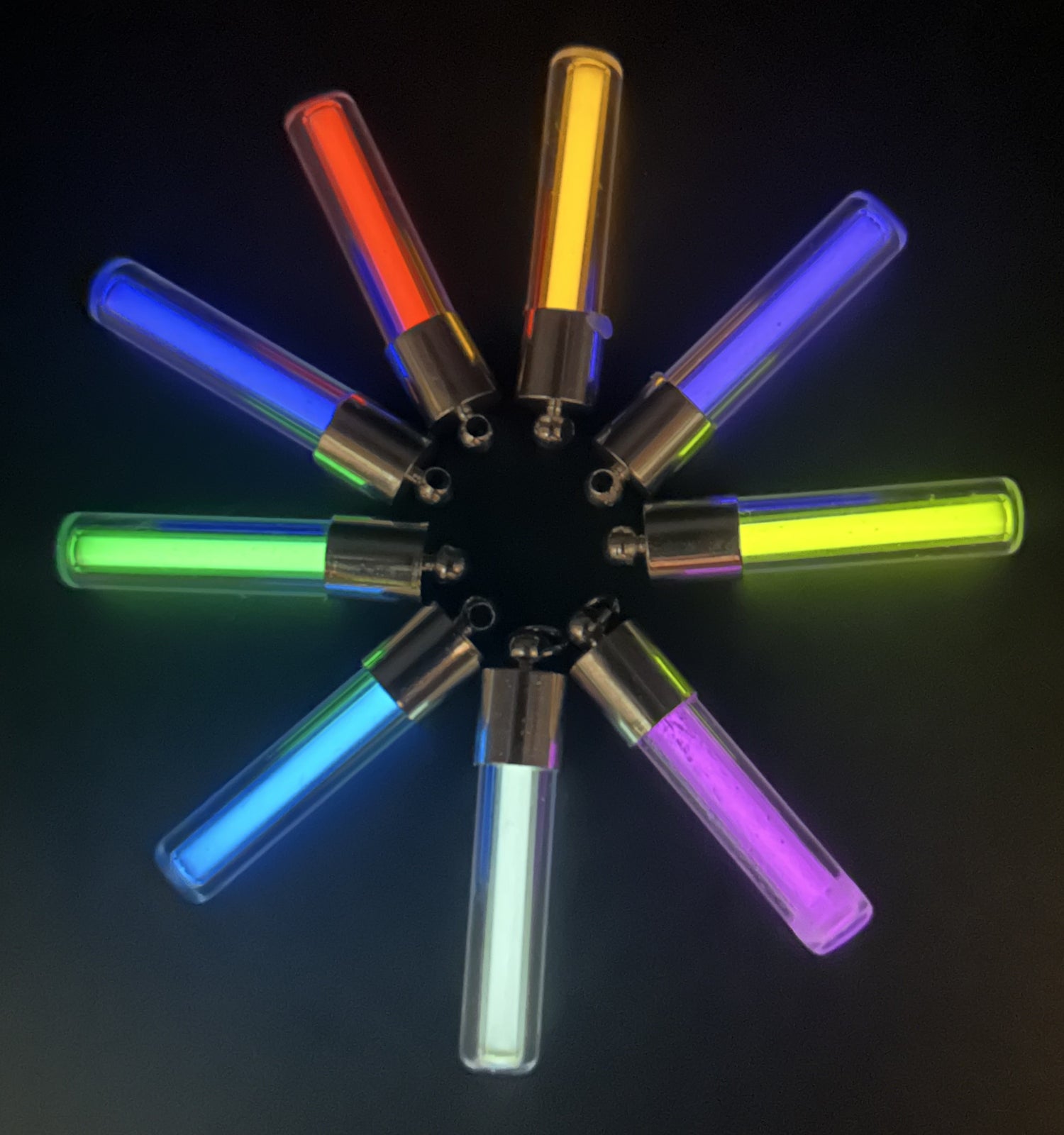Our Lumina Eterna necklace features a beautifully crafted glass tube encasing a tritium vial, providing a continuous, gentle glow available in 9 stunning colors.